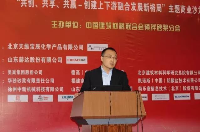 以“共創(chuàng)、共享、共贏-創(chuàng)建上下游融合發(fā)展新格局”為主題的商業(yè)沙龍由預拌砂漿分會副理事長、北京敬業(yè)達新型建材有限公司董事長張新主持。預拌砂漿分會會員單位、徐州中新機械科技有限公司總經理權躍以“綠色環(huán)保智能特種砂漿工廠”為題首先進行講解;預拌砂漿分會副理事長單位,北京金隅砂漿有限公司總經理蔡魯宏則分享了“破解預拌砂漿發(fā)展困境的思考——最新行業(yè)政策解讀”;山東方達康工業(yè)纖維素有限公司總經理馮文利則系統(tǒng)闡述了“羥丙基甲基纖維素的特性及在抹灰機噴砂漿中的應用”。