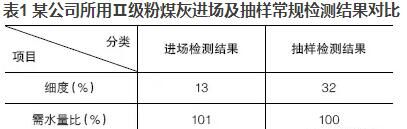 優(yōu)質(zhì)的粉煤灰摻入混凝土可明顯地改善混凝土的和易性,當(dāng)粉煤灰摻量大于膠材總量的5%~10%時,效果極為明顯。現(xiàn)今在混凝土實際生產(chǎn)中,粉煤灰摻量往往達到20%,有的甚至高達30%,但混凝土的和易性卻不盡人意。抽取原材料進行檢測時,發(fā)現(xiàn)粉煤灰的檢測結(jié)果經(jīng)常不滿足標(biāo)準要求或者與驗收時的結(jié)果相差甚遠?,F(xiàn)以某公司所用Ⅱ級粉煤灰進場及抽樣常規(guī)檢測結(jié)果進行對比,見表1。