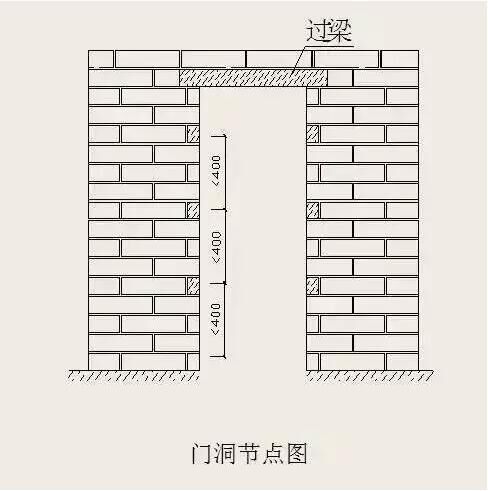 當內(nèi)墻為砌體時,應沿門洞口兩側,采取灰砂磚或水泥磚或C20混凝土預制塊,以每隔500~600mm間距替換加氣磚;門洞兩側自離地500起,采取灰砂磚或水泥磚或C20混凝土預制塊。