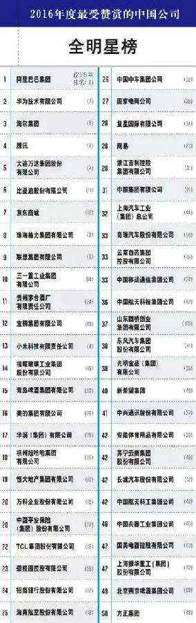 這份榜單一向被認為是中國公司軟實力的晴雨表,今年的排行榜由《財富》(中文版)通過網(wǎng)絡(luò)向35000名中國企業(yè)管理人發(fā)放問卷調(diào)查得出。調(diào)查評分標(biāo)準(zhǔn)主要包括產(chǎn)品和服務(wù)地位、長期投資價值、公司資產(chǎn)合理利用、創(chuàng)新能力、管理質(zhì)量、財務(wù)穩(wěn)健程度、吸引和保留人才的能力、社會責(zé)任、全球化經(jīng)營的有效性9個方面,綜合得分最高的50家公司榮登“最受贊賞的中國公司”全明星榜。