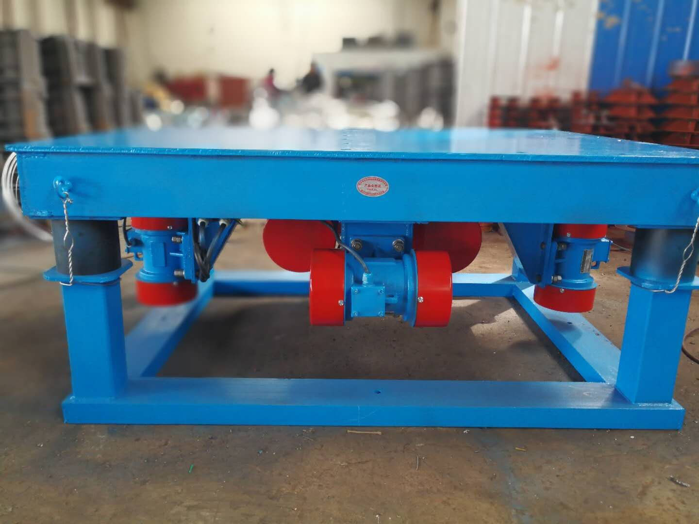 混凝土振動臺主要由臺底架、振動器彈簧等部件組成,臺面與底架均用鋼板和型鋼焊接而成,振動臺是用電動機加一對相同的偏心輪組成。并通過一對吊架聯(lián)軸器安裝在臺面(反面)中心位置,起著振實過程中平穩(wěn)、垂直方向的作用。本儀器專供實驗室內(nèi)震實成型混凝土試件及制品之用。