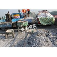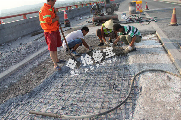 由于時間要求快,應采用混凝土特種材料進行搶修,路橋養(yǎng)護特材——搶修寶RT-2,30分鐘速凝,2小時可通行,早期強度高、后期強度不倒縮,粘結能力強,是治理橋梁路面鋪裝層病害常備的特種建材,采用風鎬對鋪裝層病害進行清除,破碎時注意水平方向分離鋪裝層與梁板,不能影響梁板的狀態(tài)和質量,對梁板頂要清除整潔,用氣泵或高壓水對梁板頂進行沖洗,不積水不滲漏的情況下,采用搶修寶RT-2特種水泥與標準石子按照要求配比,加水攪拌,迅速澆注到病害部位,抹至與路面齊平時,灑水量水進行收光,指甲掐不動混凝土時進行養(yǎng)護,2小時后即可通行。避免大面積換板,降低了工程成本。施工無需動用大型機械,對交通安全影響不大。