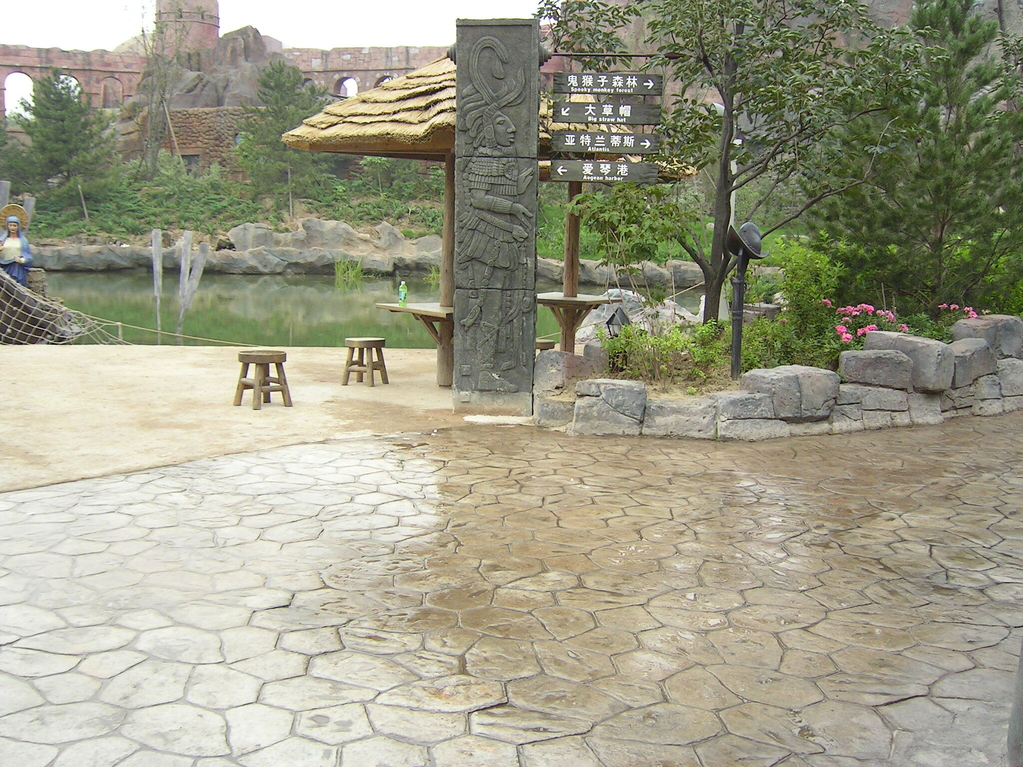 彩色壓模藝術(shù)地坪是一種新穎獨創(chuàng)的地面鋪裝體系??稍趥鹘y(tǒng)的砼材料上制作各種磚、石、木等其它材料無法達(dá)到的裝飾效果,具有圖形美觀自然、色彩豐富、質(zhì)地堅固耐用等特點,克服了傳統(tǒng)磚、石鋪設(shè)地面常有的容易松動、高低不平、縫隙長草、蟲蟻筑穴、容易起塵、路面整體性差、色彩單調(diào)、需經(jīng)常維修等特點,結(jié)合了傳統(tǒng)磚、石鋪設(shè)地面的美觀自然與砼的堅固耐用特點,是替代磚石鋪設(shè)路面的一種新型地面材料。