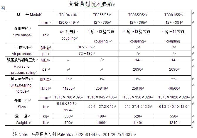 TB套管背鉗為專利產(chǎn)品,可與油田現(xiàn)使用的各類套管動(dòng)力鉗配合進(jìn)行下套管作業(yè),能提高管柱絲扣聯(lián)接質(zhì)量,減少主鉗大扭矩作業(yè)的變形,提高作業(yè)的安全性、可靠性,減輕工人勞動(dòng)強(qiáng)度,提高作業(yè)效率。該產(chǎn)品按控制方式有全氣、液控兩種。設(shè)有扭矩傳感器,可精確測出管柱聯(lián)接的扭矩。表中為背鉗參數(shù)。動(dòng)力鉗符合SY/T5074標(biāo)準(zhǔn)和API Spec 7K規(guī)范。